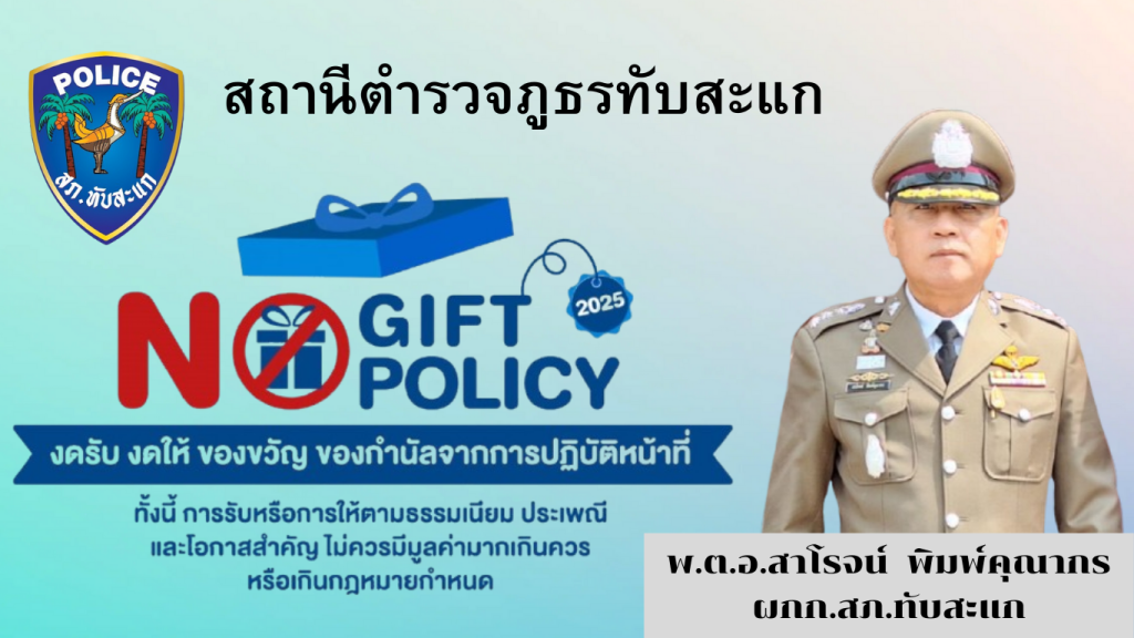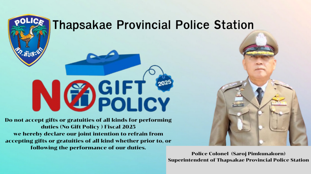- ประกาศสำนักงานยุทธศาสตร์ตำรวจเรื่องเจตนารมณ์ที่จะไม่รับของขวัญหรือของกำนัลทุกชนิดจากการปฏิบัติหน้าที่